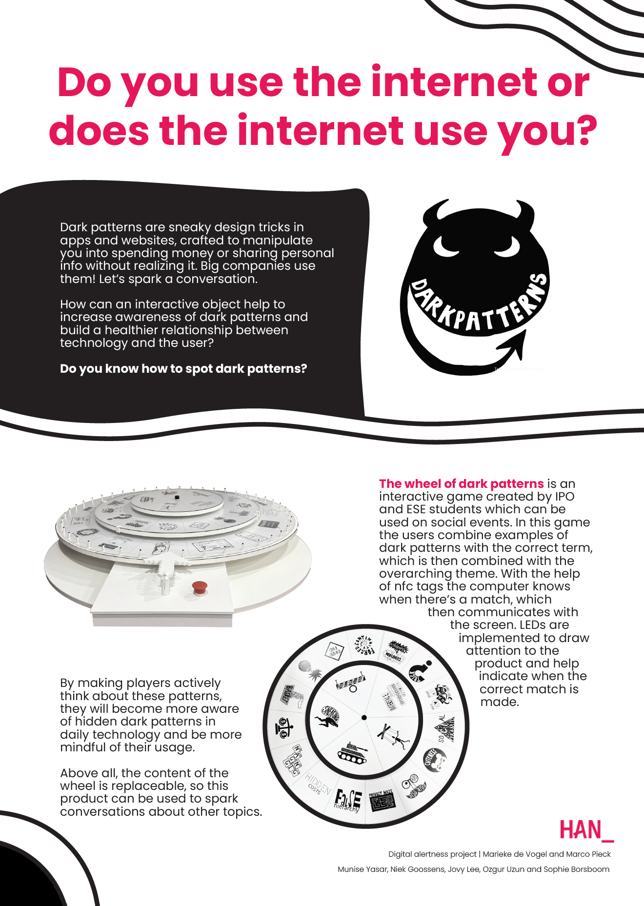 The wheel of Dark Patterns is an interactive game created by Industrial Product Design and Embedded System Engineering students which can be used on social events. In this game the users combine examples of dark patterns with the correct term, which is then combined with the overarching theme. With the help of nfc tags the computer knows when there’s a match, which then communicates with the screen. LEDs are implemented to draw attention to the product and help indicate when the correct match is made. By making players actively think about these patterns, they will become more aware of hidden dark patterns in daily technology and be more mindful of their usage. Dark patterns are sneaky design tricks in apps and websites, crafted to manipulate you into spending money or sharing personal info without realizing it.