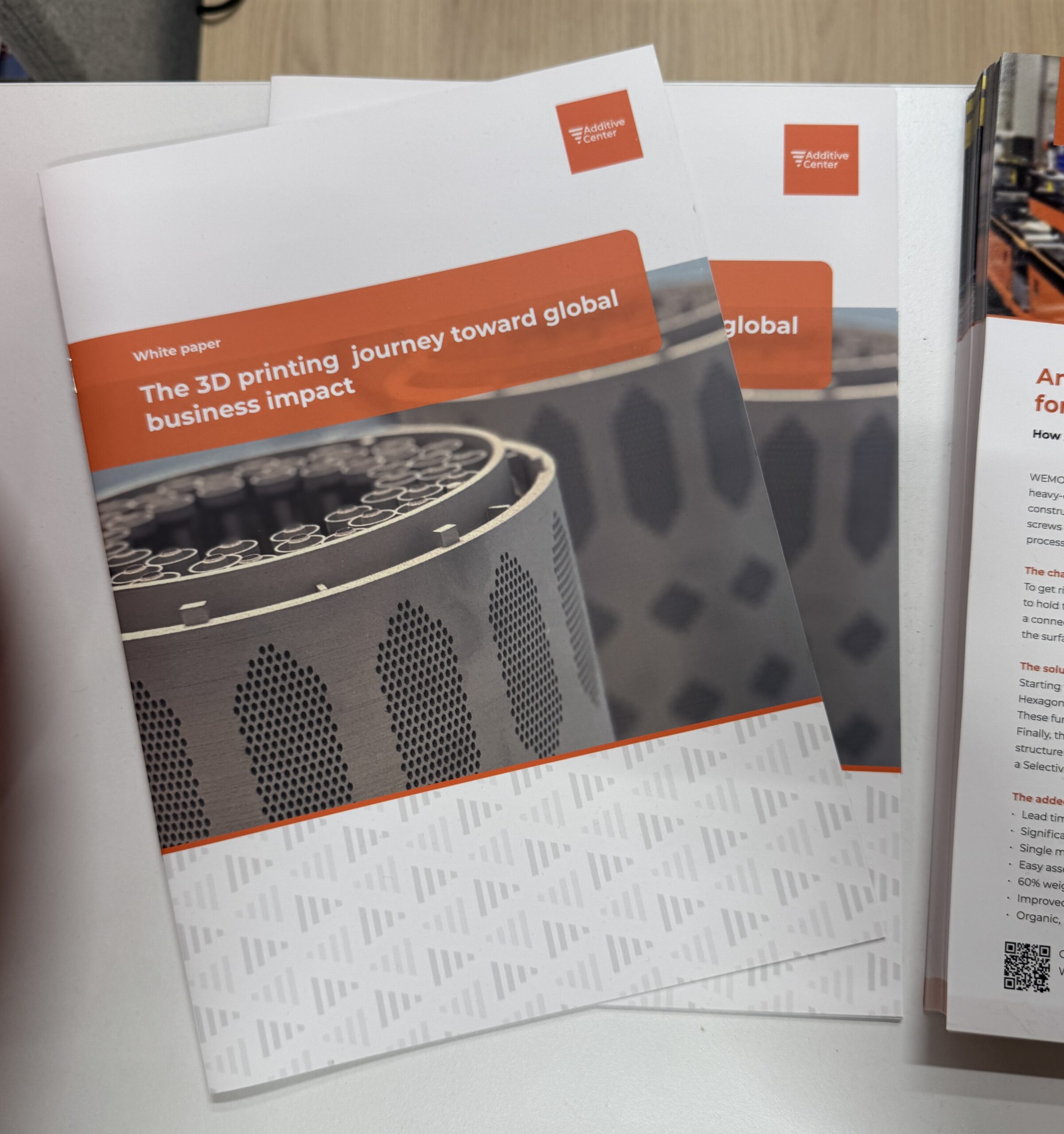 On the left is a White Paper I designed for Additive Center. They requested a cohesive, minimalistic design that aligned with their branding to present their white paper. The goal was to incorporate visuals to break up the text and highlight some of our customer cases, helping to support and illustrate the information discussed. This was printed as a magazine to hand out to visitors on events.