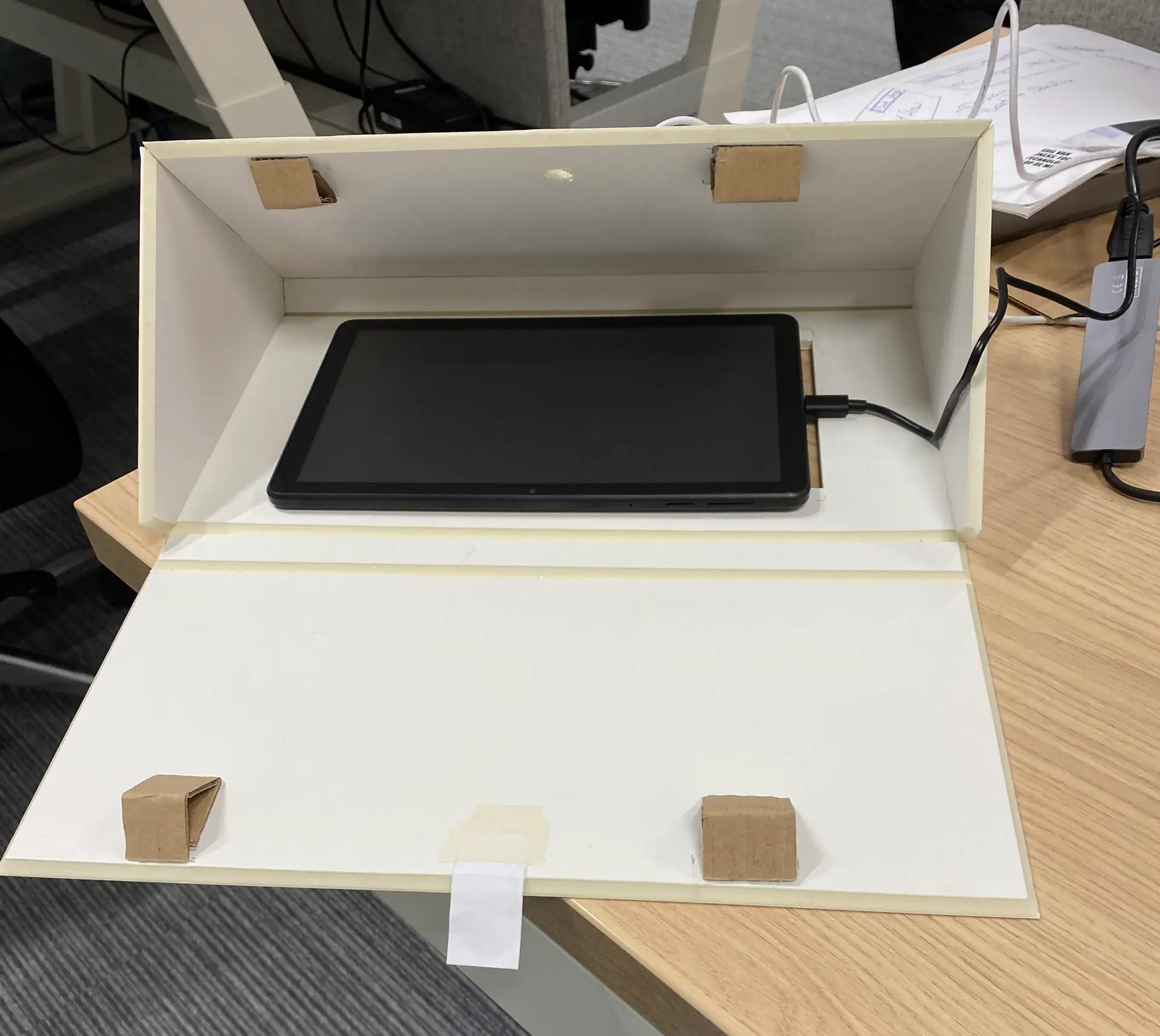 The design is a sleek column with a screen for product information and a custom 3D-printed holder for the items. Made from cardboard with wooden accents, it features the company’s logo and pattern. The screen is housed in a foam board compartment with magnetic access, while the minimal white holder keeps the focus on the displayed product.